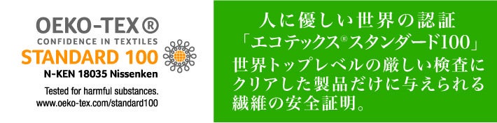 「エコテックス®スタンダード100」は、350を超える有害化学物質が対象となる厳しい分析試験をクリアした製品だけに与えられるの安全な繊維製品の証です。 素肌すずやかパンツは「エコテックス®スタンダード100」が認証した安心安全な商品です。