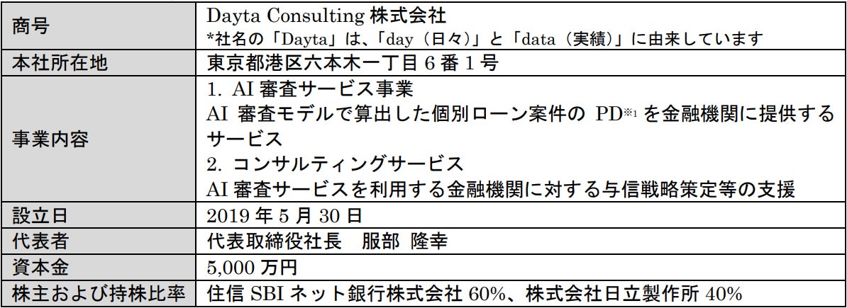 Dayta Consultingは、地域金融機関をはじめとした金融機関に対し、稀な事象の発生を予測する日立の人工知能「Hitachi AI Technology/Prediction of Rare Case」と、住信SBIネット銀行のデータハンドリング技術・ノウハウを組み合わせ、住宅ローンおよび法人向けトランザクション・レンディングを対象とした革新的なAI審査サービスを開発・提供してまいりました。