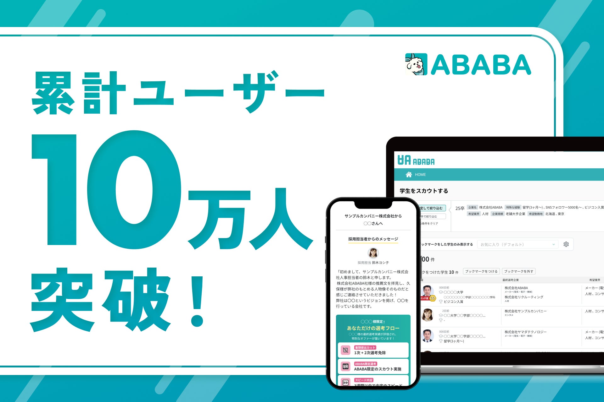 株式会社ABABA(本店:東京都目黒区、代表:久保駿貴・中井達也、以下ABABA)は、就活の過程を評価する『ABABA』の累計ユーザー数が10万人を突破したことをお知らせします。