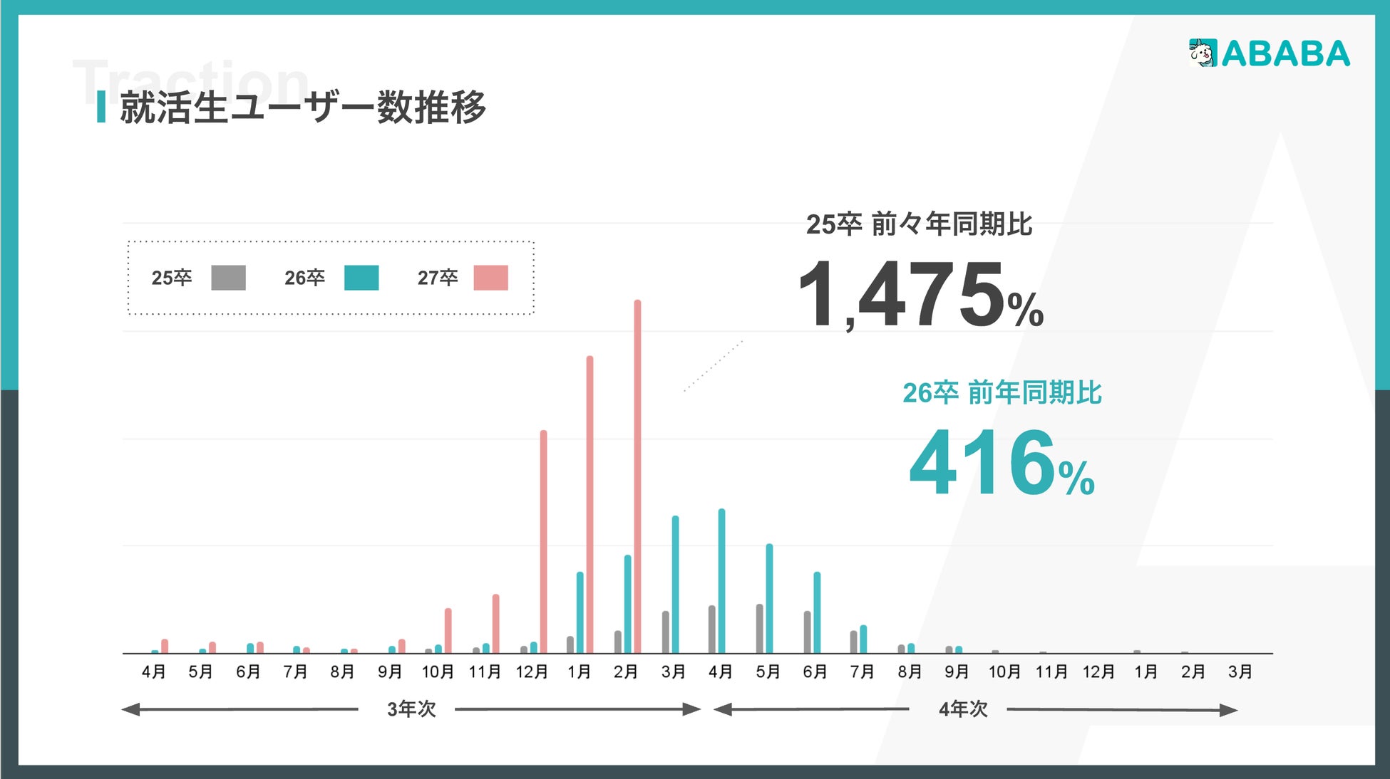 2025年卒学生の利用者数は約4万人、累計利用企業数も2,300社にのぼるなど成長を続けており、2026年卒学生の利用者数も去年を大きく上回る水準で推移しています。