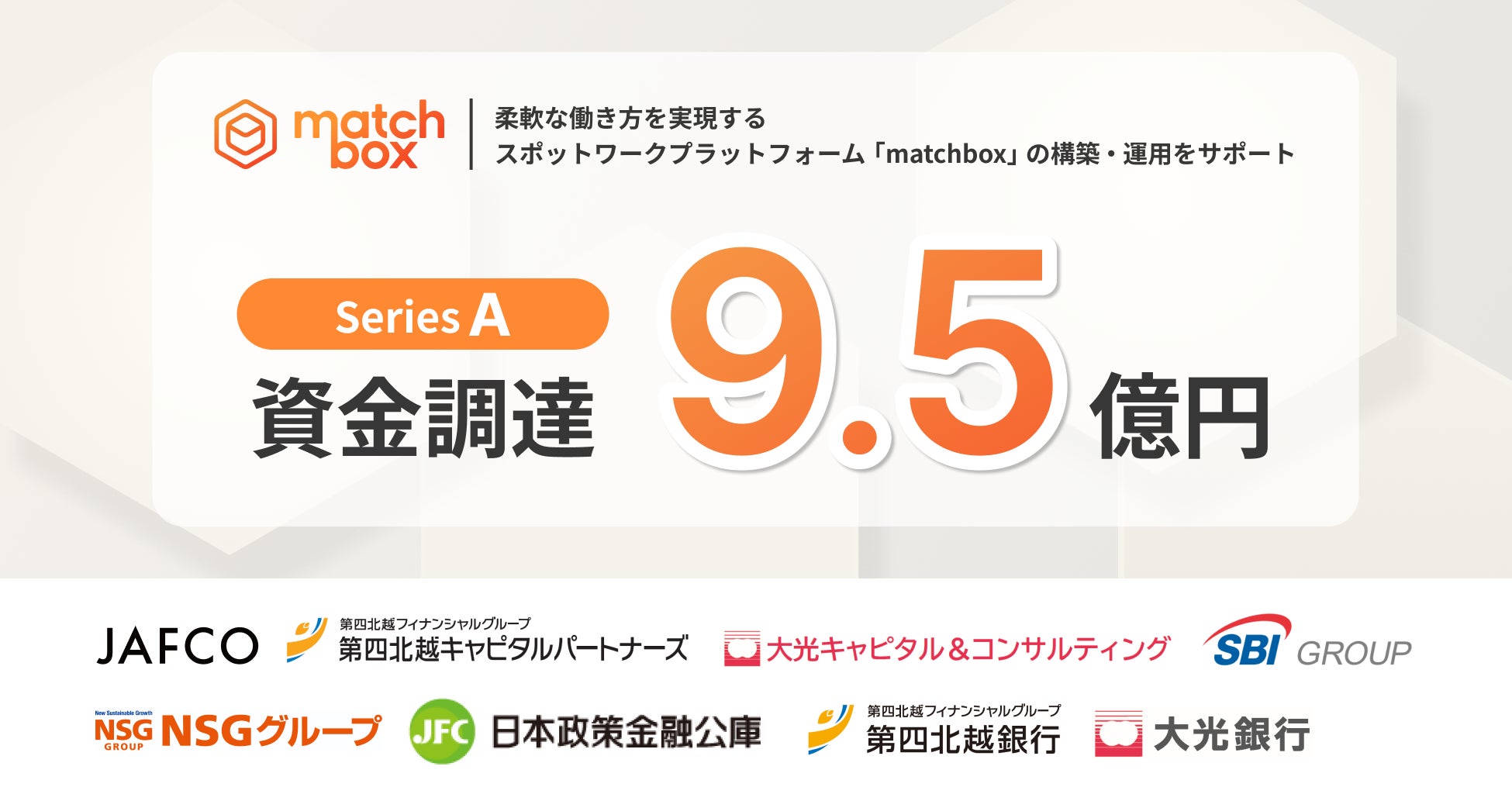 株式会社Matchbox Technologies(マッチボックステクノロジーズ 本社:新潟県新潟市中央区、代表取締役社⻑:佐藤 洋彰)は従業員・パートタイマー・アルバイト・スポットワーカーを含めた各社独⾃の⼈材プールを構築し、1日・数時間単位の求人と働き手をオンラインでマッチングするスポットワークプラットフォーム「matchbox(マッチボックス)」の構築・運用をサポートしています。今回、マッチボックステクノロジーズは、シリーズAラウンドとして総額9.5億円の資金調達(デットファイナンス含む)を行いました。マッチボックステクノロジーズは「matchbox」の効果の実証を終え、本格的に「matchbox」の事業拡大に注力します。今回の資金調達についてエクイティファイナンスで日本有数の投資会社の一つであるジャフコ グループ株式会社が運営するファンドをはじめ、第四北越キャピタルパートナーズ、大光キャピタル&コンサルティング(SBIグループとの共同ファンド)、NSGホールディングスに参加いただきました。併せてデットファイナンスで日本政策金融公庫、第四北越銀行、大光銀行に参加いただいております。