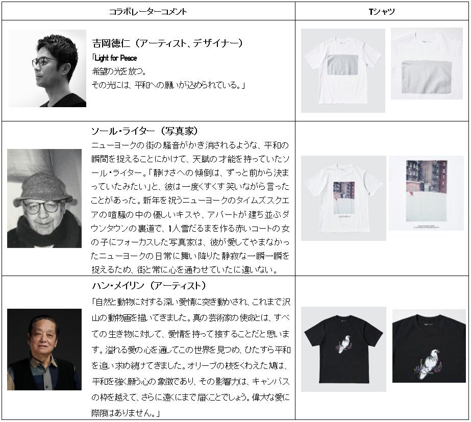 ユニクロは、チャリティTシャツプロジェクト「PEACE FOR ALL」の新コレクションを、6月21日(金)に発売します。「PEACE FOR ALL」は、「世界の平和を心から願い、アクションする」という趣旨に賛同したコラボレーターにボランティアでご協力をいただき、その利益の全額を寄付するプロジェクトです。このたび、新たなコラボレーターとして、アーティスト/デザイナーの吉岡徳仁氏、写真家のソール・ライター氏、 アーティストのハン・メイリン氏の3名が加わり、平和への願いを込めてデザインしたTシャツが登場します。