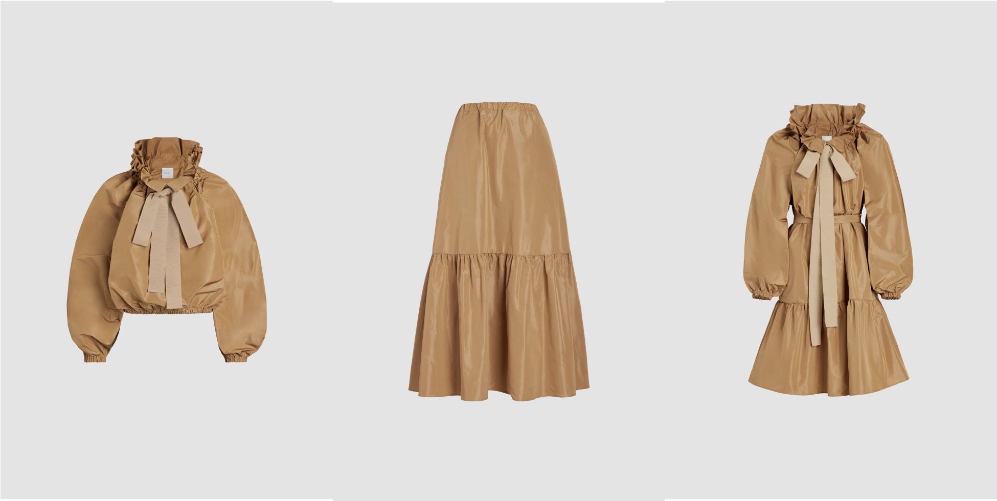 秋らしいグレイサンドカラーのアイテムは、しなやかなリサイクルポリエステルのタフタを使用。