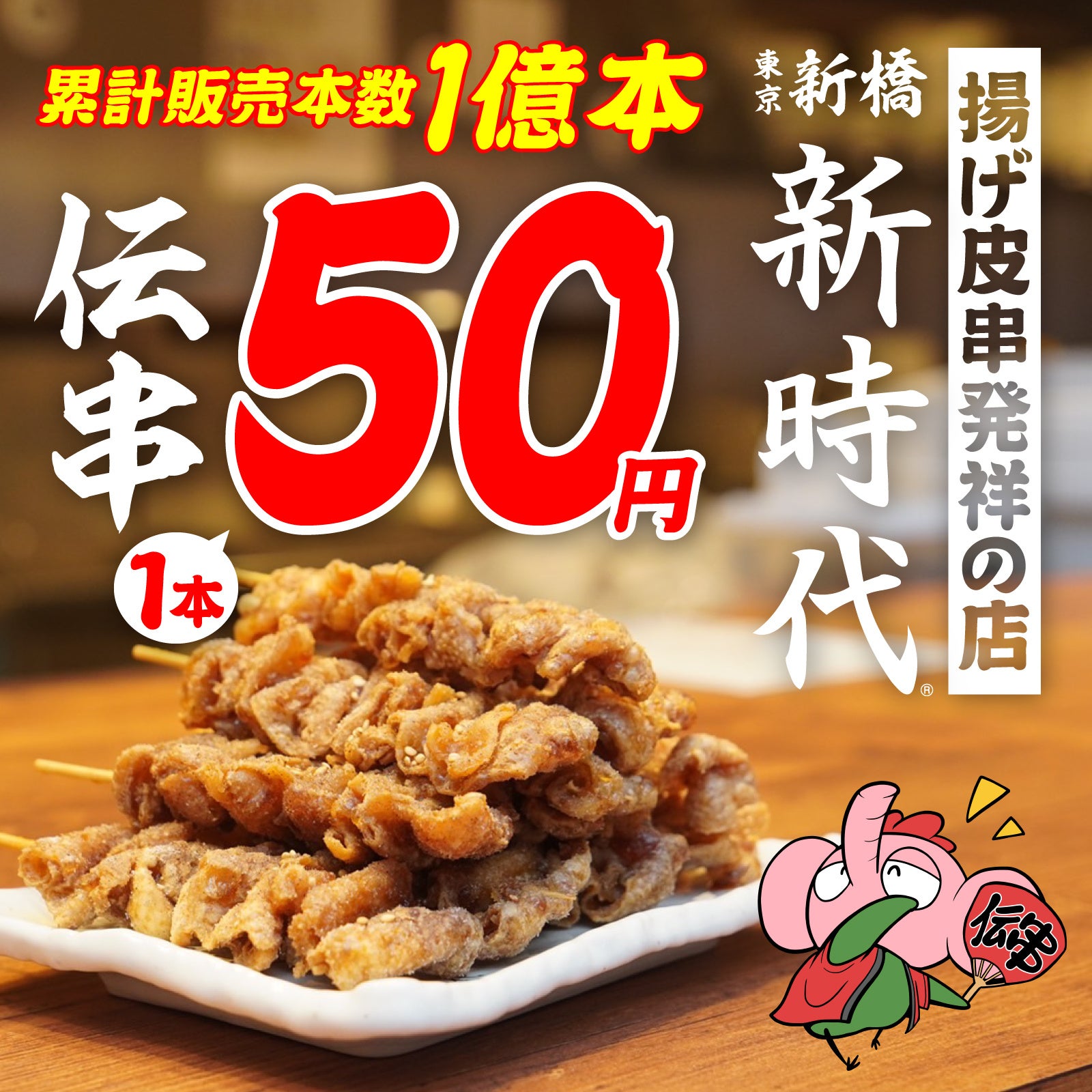 ブラジルの元プロサッカー選手の『佐野直史』が開発した「伝串®」。特許庁からも認められた唯一無二の揚げ皮串。「旨い」と「健康」をコンセプトに開発した『新時代』の看板商品。「健康」を追求すれば味が損なわれ、「旨い」を追求すれば 「健康」が実現しないと苦闘しながらも、創業者の佐野自らが一切の妥協を許さず、試作 を繰り返して完成させました。
