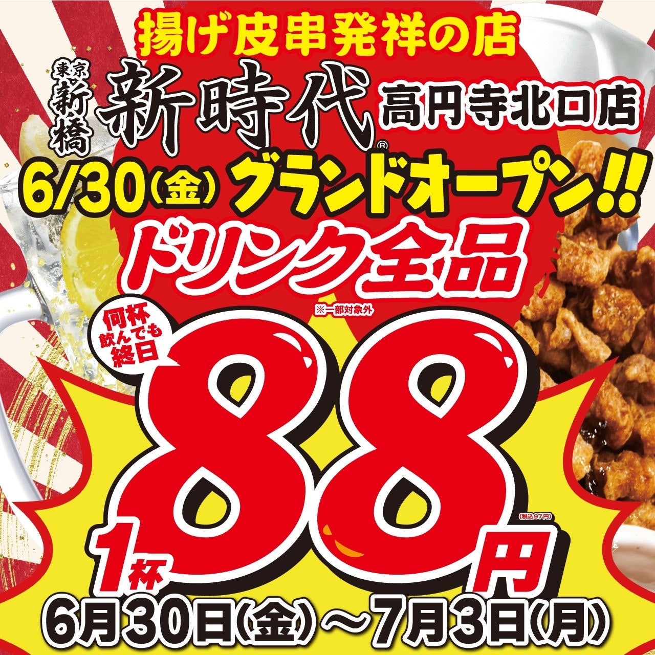「新時代 高円寺北口店」のオープンを記念し、ドリンク全品を1杯88円でお楽しみ頂けるキャンペーンを開催します。