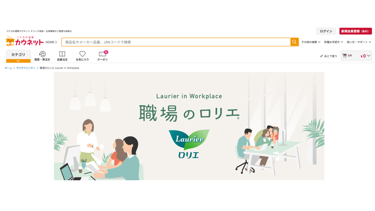 コクヨグループでEコマースサービスを提供する株式会社カウネット(本社:東京港区/代表取締役社長:宮澤典友 以下、カウネット)は、花王株式会社の生理用品ブランド『ロリエ』が展開する、生理用ナプキンの備品化プロジェクト『職場のロリエ』の取り組みに賛同し普及に向けた活動を推進すべく、2025年3月27日(木)より、カウネットのECサイトにおいて「職場のロリエ導入セット」の販売を開始したことをお知らせします。