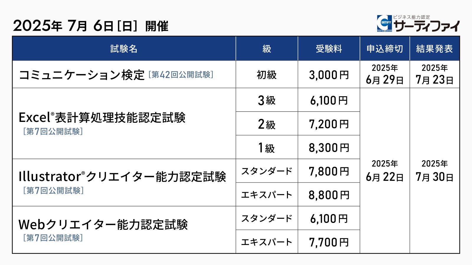 株式会社サーティファイ(本社:東京都中央区、代表取締役:瀧澤茂、以下「サーティファイ」)は、2025年7月6日(日)に開催する「コミュニケーション検定」「Excel®表計算処理技能認定試験」「Illustrator®クリエイター能力認定試験」「Webクリエイター能力認定試験」の公開試験の申込受付を2025年4月22日より開始しました。