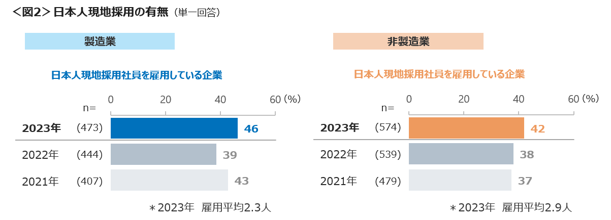 日本人現地採用社員を雇用している企業は、製造業で46%、非製造業で42%であり、製造業、非製造業ともに昨年より増加。平均雇用人数は製造業で2.3人、非製造業は、2.9人である。<図2>