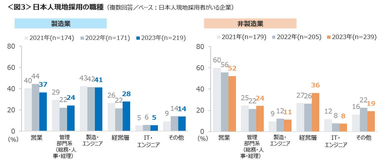 日本人現地採用の職種は、製造業では「製造・エンジニア」が41%、次いで「営業」の37%、非製造業では「営業」が52%と多く、次いで「経営層」が36%。コロナ禍以降、日本人現地採用の雇用を検討する企業が増えており、営業や技術職に限らず管理職クラスの優秀な人材の需要が益々高まっていくことが考えられる。<図3>