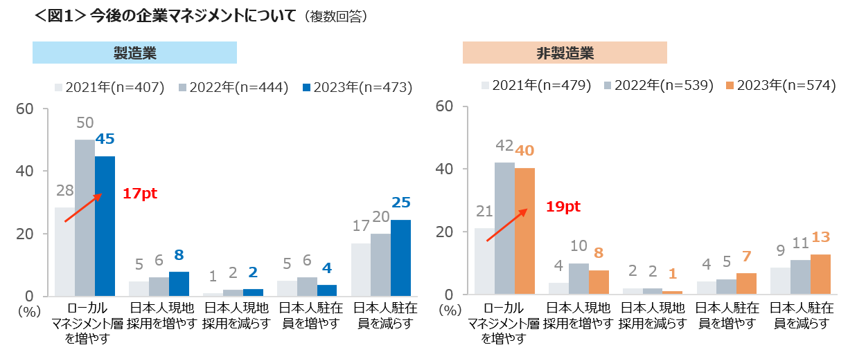 今後の企業マネジメントでは、製造業の45%、非製造業の40%が「ローカルマネジメント層を増やす」と回答。コロナ禍であった2021年と比較すると、製造業は17pt増加、非製造業も19pt増加と、増加幅が大きい。製造業、非製造業ともに「日本人駐在員を減らす」が増加傾向にある。このことから企業マネジメントの現地化が進むと見られる。 <図1>