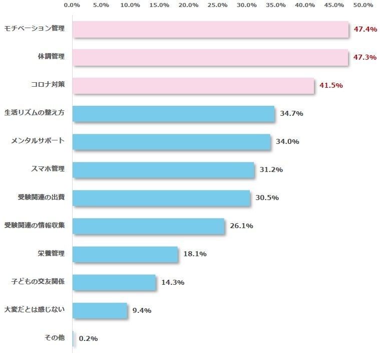 次に、子どもの受験をサポートするにあたって、大変だと感じることを伺ったところ、最多回答は「モチベーション管理(47.4%)」、次に「体調管理(47.3%)」、「コロナ対策(41.5%)」と続きました。