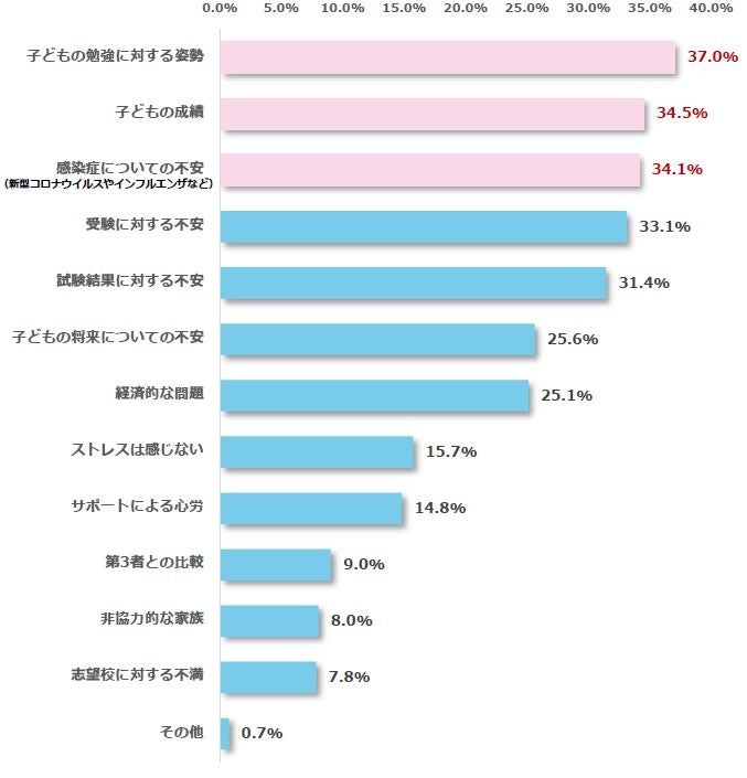 子どもの受験をサポートするにあたって、どのようなストレスを感じているか質問したところ、最多回答は「子どもの勉強に対する姿勢(37.0%)」、次に「子どもの成績(34.5%)」、「感染症(新型コロナウイルスやインフルエンザなど)についての不安(34.1%)」と続きました。一方でストレスを感じないと回答した方は15.7%という結果になりました。