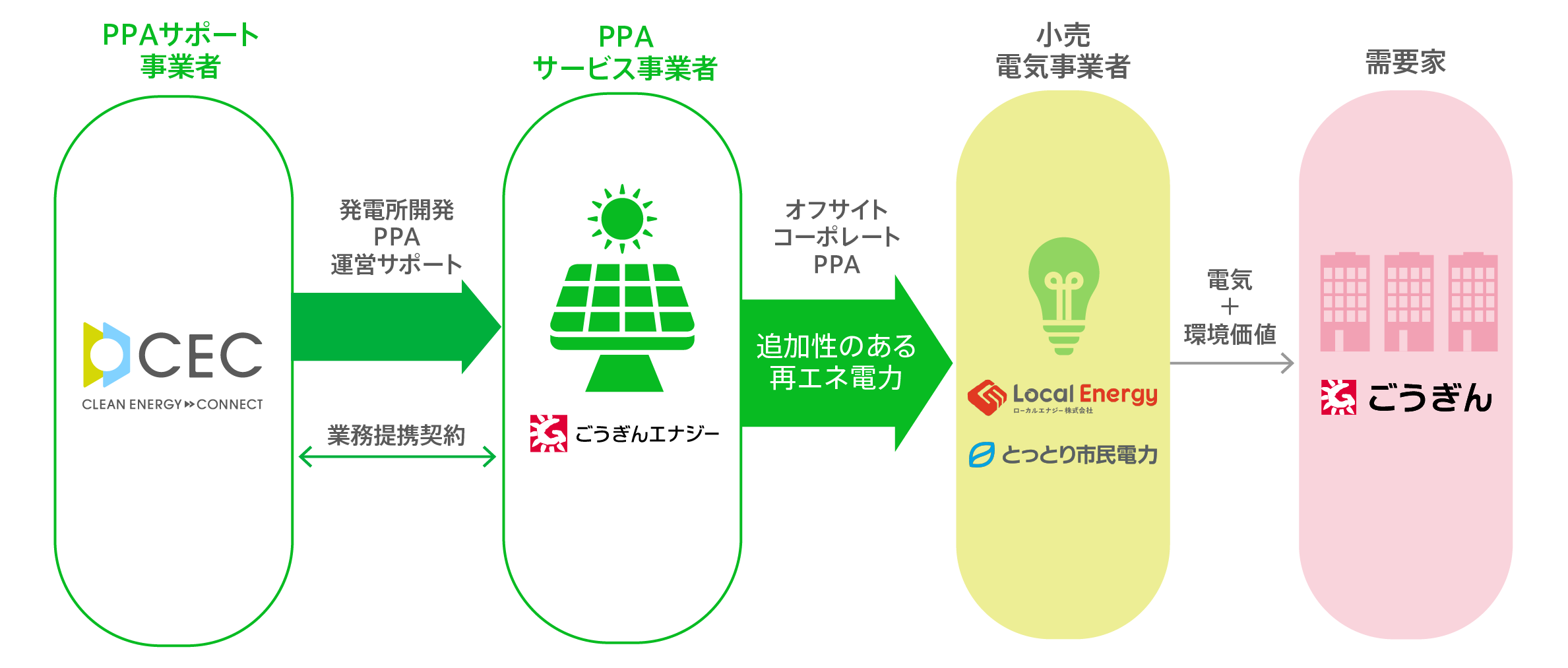 本オフサイトコーポレートPPAサービス(以下、「本サービス」)は、ごうぎんエナジー株式会社が開発した太陽光発電所で発電した電気をローカルエナジー株式会社(代表取締役 加藤 典裕)および株式会社とっとり市民電力(代表取締役 児嶋 太一)が小売電気事業者として、山陰合同銀行の30事業所へ供給します。 本サービスの取り組みにあたり、ごうぎんエナジー株式会社は、株式会社クリーンエナジーコネクト(代表取締役 内田 鉄平)との業務提携契約により、同社から太陽光発電所の開発、電力料金の精算、関係者間の調整などのサポートを受けております。