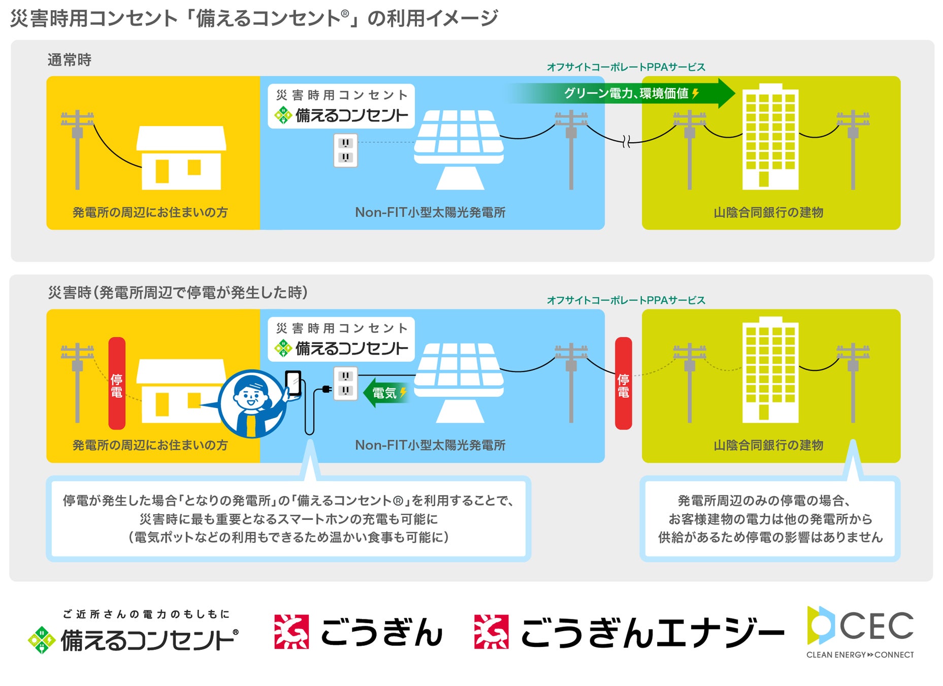 今回の取り組みで開発する山陰合同銀行専用のNon-FIT小型太陽光発電所には、発電所の設置地域で災害等により停電が発生した際に、周辺にお住まいの地域住民のみなさまが電力を利用できる災害時用コンセント「備えるコンセント®」を設置します。これにより、発電所の設置地域に対するレジリエンス向上、地域とのより一層の共生を図ってまいります。