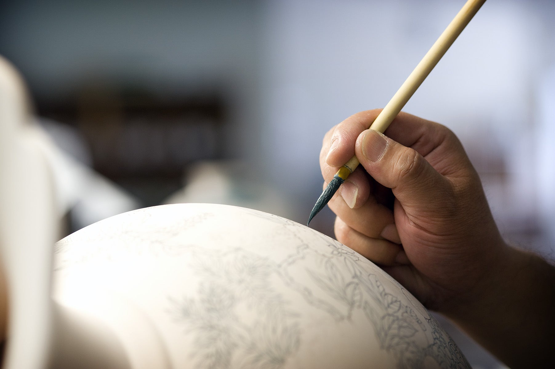 「瑠璃」はロイヤルブルーとも呼ばれ、古代から高貴の象徴とされています。陶磁器で「瑠璃」は、高い技術と経験が必要とされ、香蘭社ならではの長年の技術開発と品質管理のもとに深く透明感のある、「瑠璃」が実現します。香蘭社では、1960年頃から古代メソポタミアの「ラピス・ラズリ」の鮮やかなブルーを有田磁器に求め、現代においても高評価を得ており、香蘭社を代表する色釉の一つです。