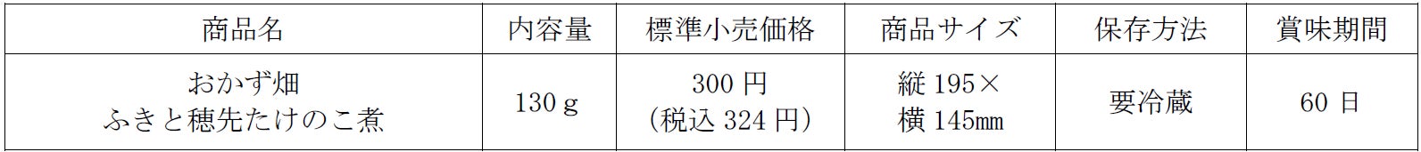 今回、新たに発売する「おかず畑 ふきと穂先たけのこ煮」は、下処理に時間がかかるふきを使用した商品です。忙しい生活の中でも、気軽に栄養バランスのとれたていねいな食事をしていただきたいという思いから、手間がかかるふき、たけのこを使用した包装惣菜を開発いたしました。手間いらずでサッと出せる副菜として、日々の食卓を彩ります。
