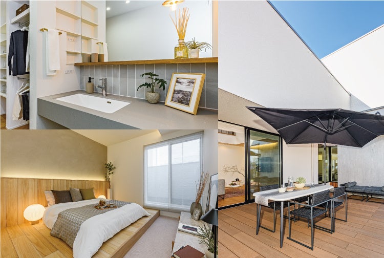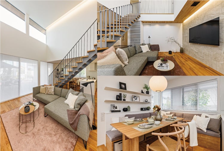 モデルハウス内は、ニューノーマル時代に対応した動線計画で洗濯等の家事動線をスムーズにし、家事コーナーやワークスペースも設けております。趣味の空間としても利用できるビルトインガレージや広々としたウッドデッキも設けて、外でも趣味や家族との時間を楽しめる環境となっており、多様な生活シーンに活用いただけます。また、階段・吹抜を組み合わせることで垂直方向の空間的広がりを持たせることができ、家族それぞれがゆったりと安心して過ごせる空間構成となっております。