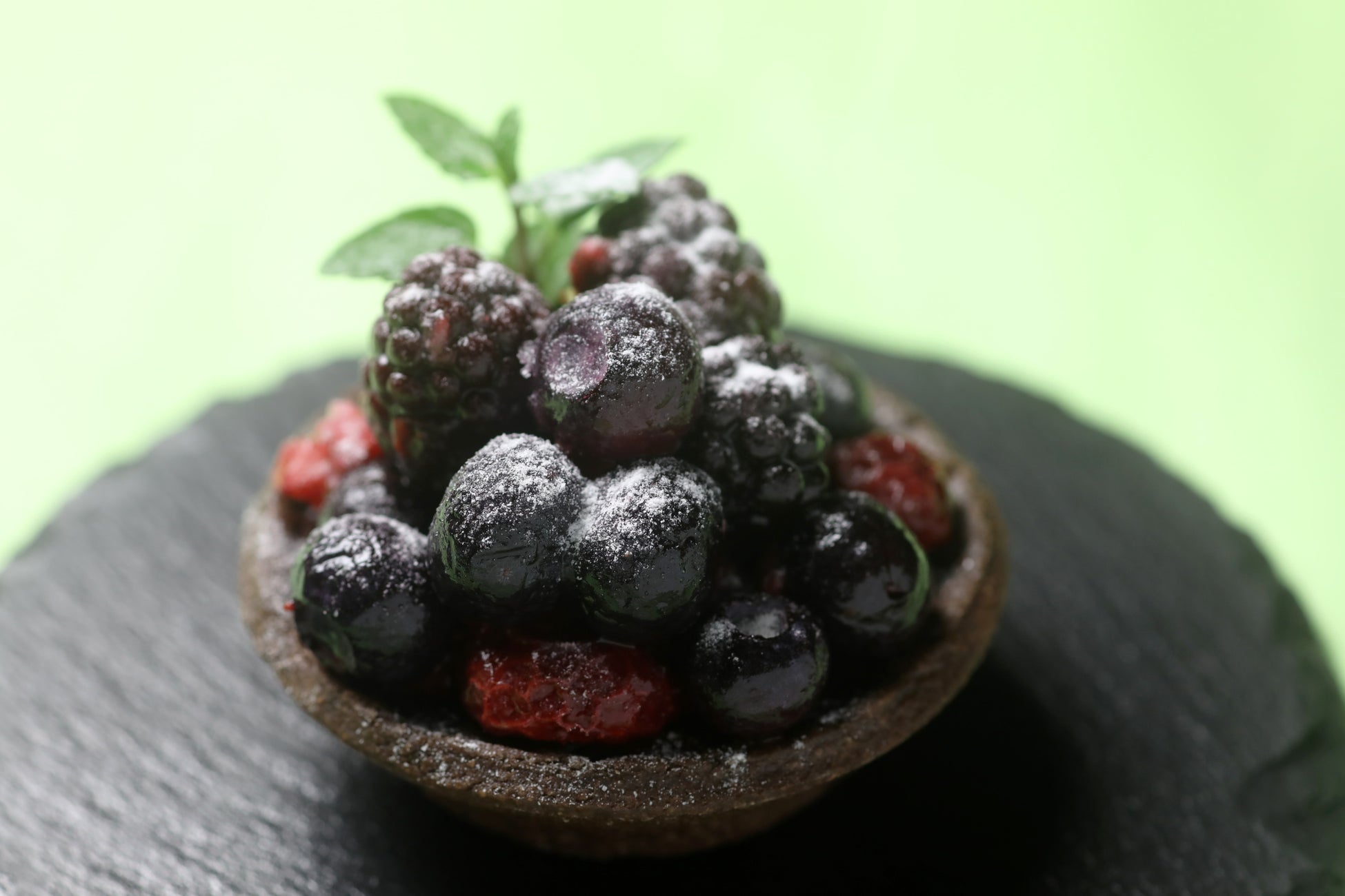 植物生まれのチョコタルトに、甘酸っぱいラズベリーとブルーベリーをトッピングし、爽やかなミントを添えた華やかな一皿。濃厚なチョコの味わいとフルーツの酸味が絶妙に調和し、見た目にも美しい贅沢なデザートです。