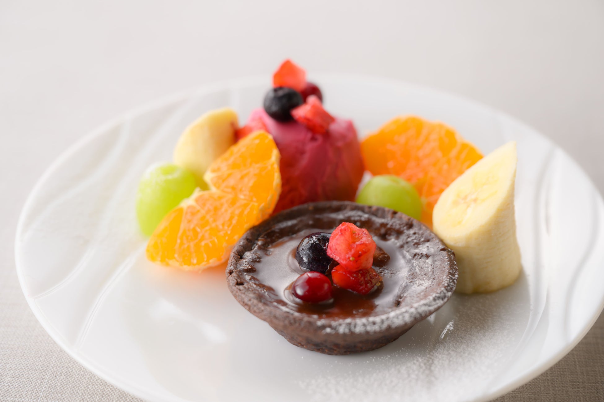 濃厚なチョコタルトは温めることでとろりとした食感をお楽しみいただけます。爽やかな酸味のカシスジェラートとフレッシュフルーツを添えました。