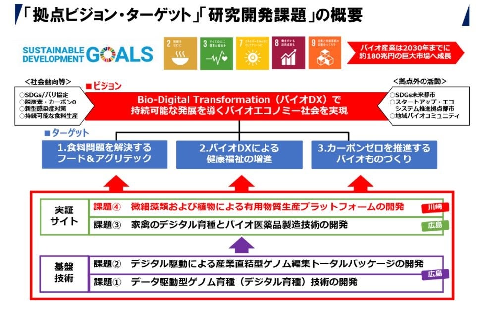 本プロジェクトは、広島大学を中心とした「バイオDX産学共創拠点」を構築し、SDGsに基づくあるべき将来像の構想として、下図に示す3つのターゲットを掲げており、全体で4つの課題が設定されました。当社が参画する研究グループは、研究開発課題リーダーである太田啓之 東京工業大学 名誉教授((株)ファイトリピッド・テクノロジーズ代表取締役CEO)のもと、ターゲット1および3を主な目標とする課題④「微細藻類および植物による有用物質生産プラットフォームの開発」に、産・学・官で取り組みます。