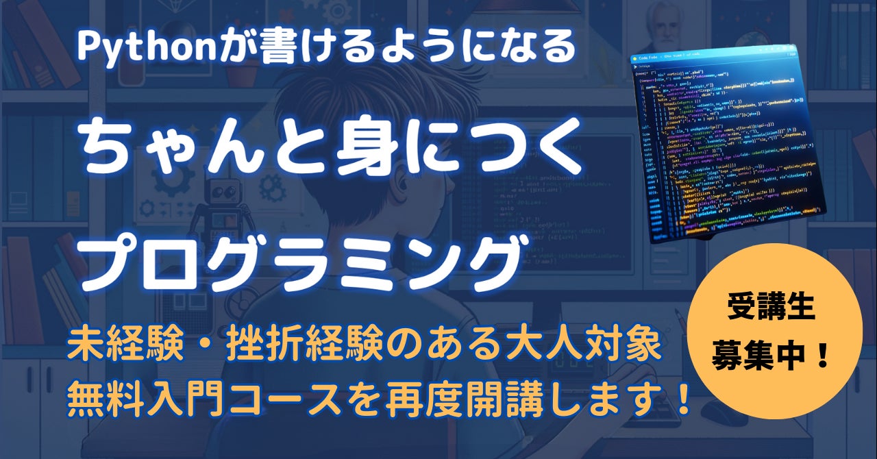 面倒な設定不要・ライブ授業内で実際にプログラミングを書いて演習してPythonを習得する『ちゃんと身につくプログラミング "大人版"』の入門コース(2ヶ月全8回)を無料で開講します。