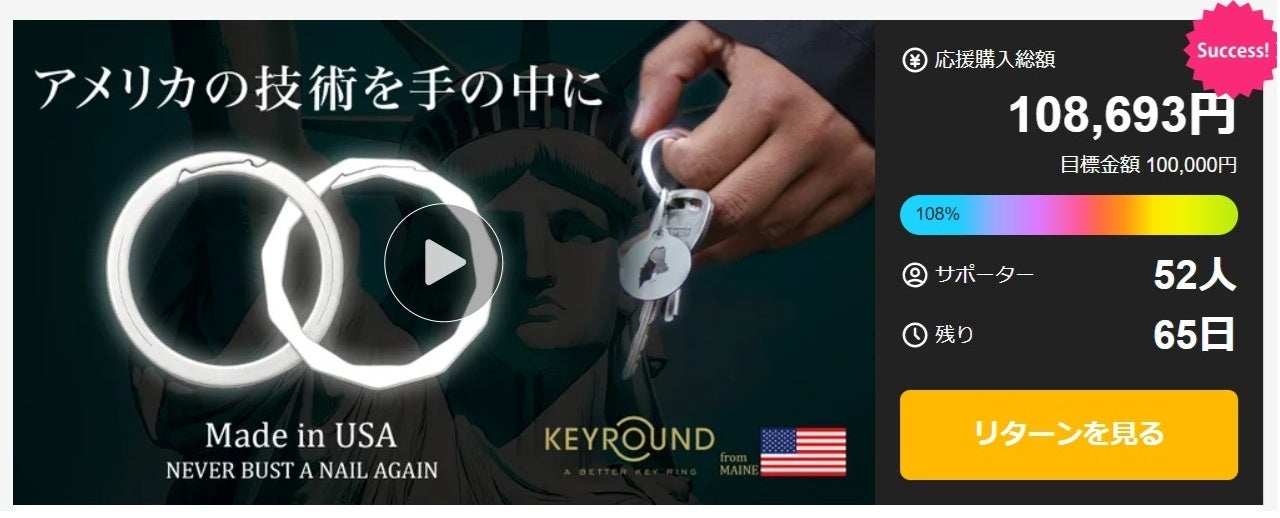 米国特許取得の“爪を痛めないキーリング”として注目を集める「KEYROUND」が、Makuake(マクアケ)でのクラウドファンディングプロジェクト開始から30分で目標金額を達成しました。