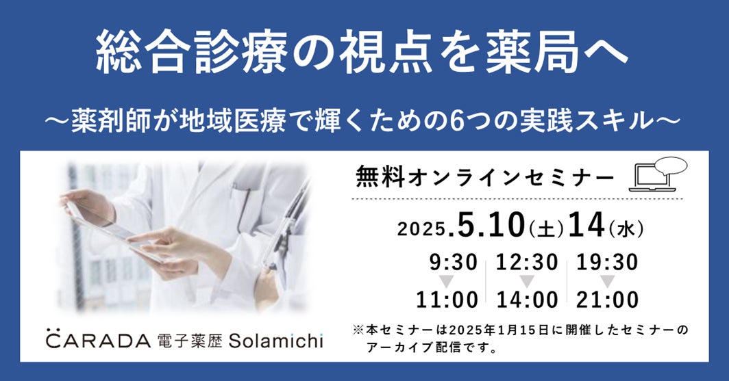 株式会社ソラミチシステム(東京都新宿区、代表取締役:田浦 貴大)は、本年1月に開催した、無料オンラインセミナー「総合診療の視点を薬局へ ~薬剤師が地域医療で輝くための6つの実践スキル~」を、ご好評につき、5月10日(土)、14日(水)に無料で視聴可能なアーカイブ動画で公開します。