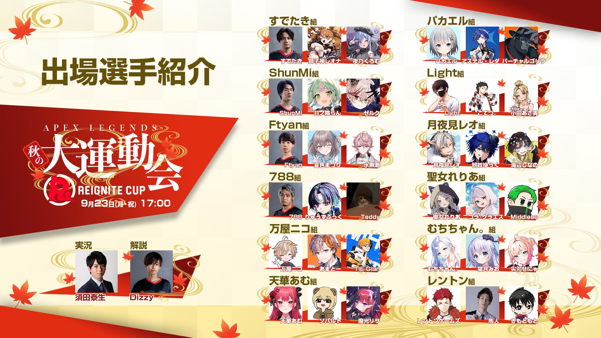 プロeスポーツチーム「REIGNITE」が9月23日(月・祝)に『REIGNITE CUP 〜 APEX LEGENDS 秋の大運動会 〜』を開催いたします。
