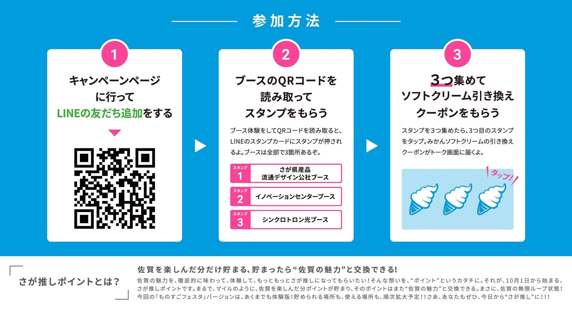 「SAGAものスゴフェスタ9」で提供する体験版は、会場内でブース出展する「(公財) 佐賀県産業振興機構」の「さが県産品流通デザイン公社」、「佐賀県産業イノベーションセンター」、「九州シンクロトロン光研究センター」の3つのブースを体験し、LINEミニアプリでスタンプを集めアンケートにご協力いただくと、「道の駅ひんやりスイーツ総選挙」で2年連続 佐賀県1位の佐藤農場“みかんソフトクリーム”がもらえる、ものスゴ限定企画「さが推しポイント」スタンプラリーとなります。