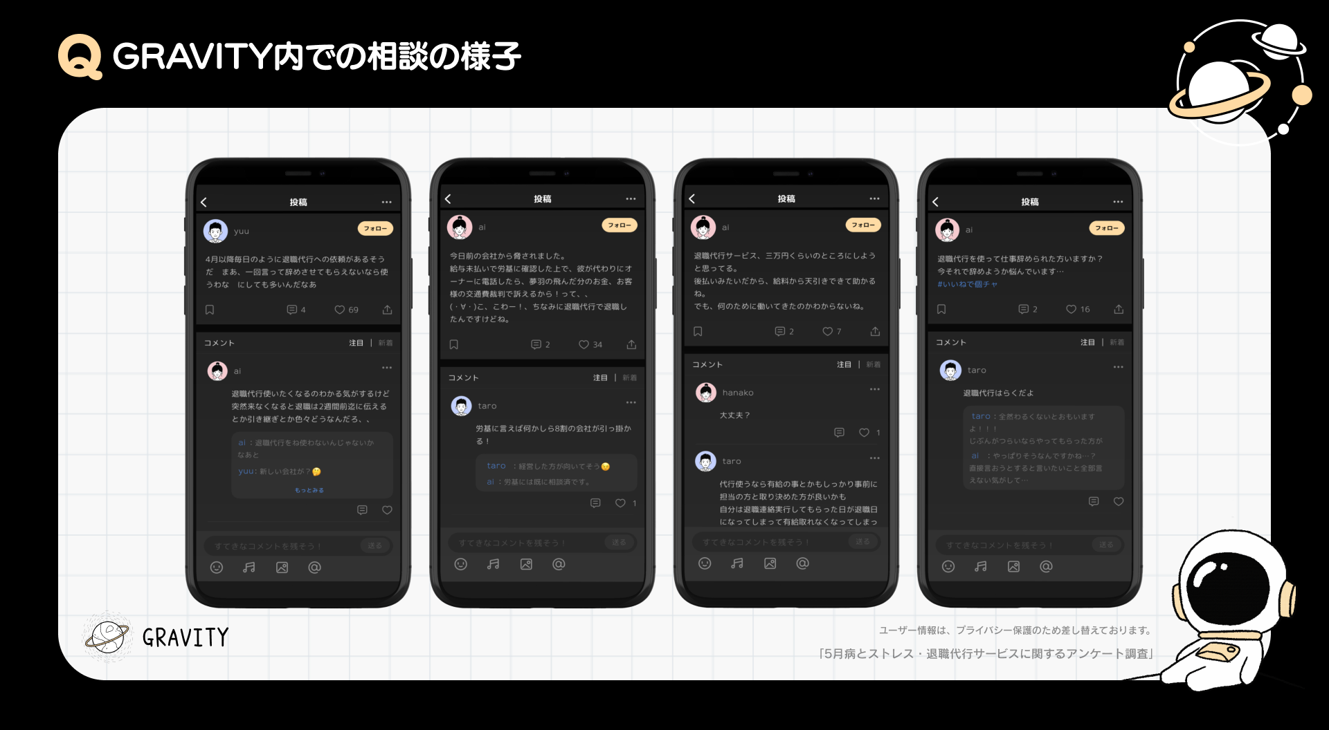 当社が運営する『GRAVITY』では、誰かに個人を特定される心配がなく気楽に投稿できる安心な環境なため、周囲に相談しづらい退職や退職代行についても相談やアドバイスが行われています。近しい間柄では相談しづらいことや誰かにちょっと聞いてほしい悩みなど、安心安全な環境が整っている『GRAVITY』で相談してみてはいかがでしょうか。