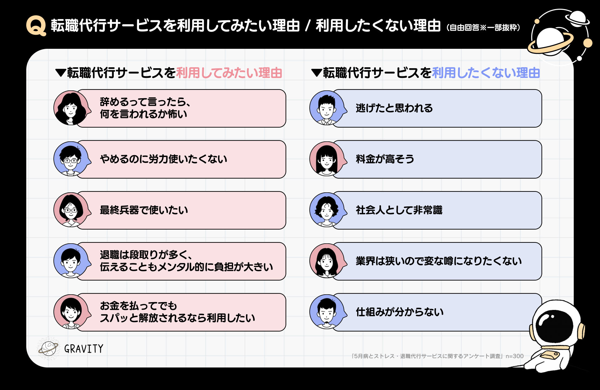 一方、「退職代行を利用したくない理由」としては、「逃げたと思われる」「社会人として非常識」「業界は狭いので変な噂になりたくない」など、自身のモラルに反したくないと考えている方や、「料金が高そう」「仕組みがわからない」など、退職代行サービスについて詳しく知らないために利用したくないと考えているようです。
