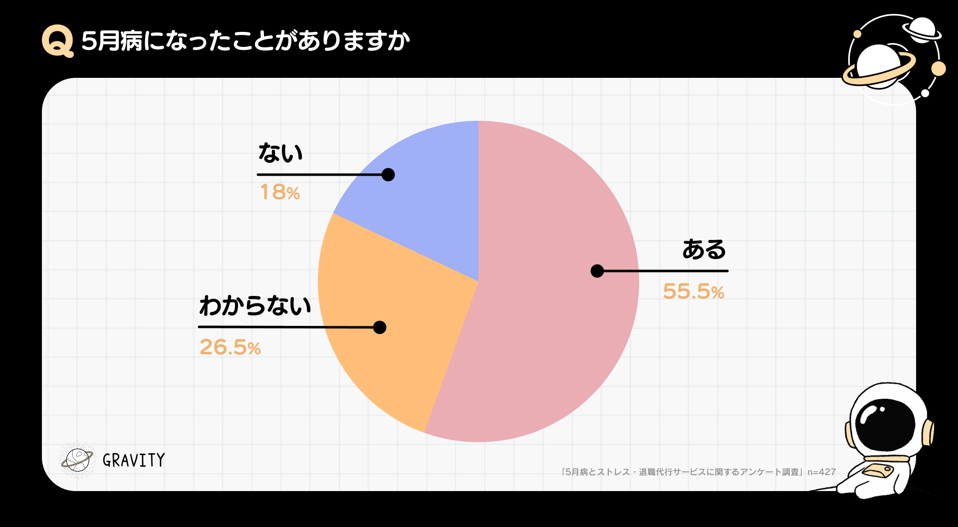 「5月病になったことがありますか?」という質問に対して「ある」と回答した方が55.5%と最も多く、次いで「わからない(26.5%)」「ない(18.0%)」と続いており、半数以上が5月病になったことがあると実感している結果でした。