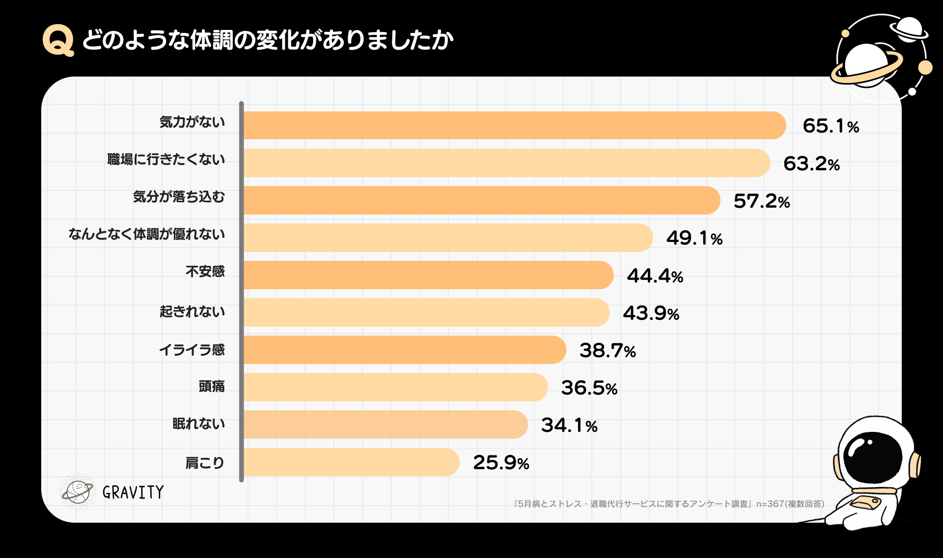 5月病による体調の変化は、「気力がない」「職場に行きたくない」が6割。