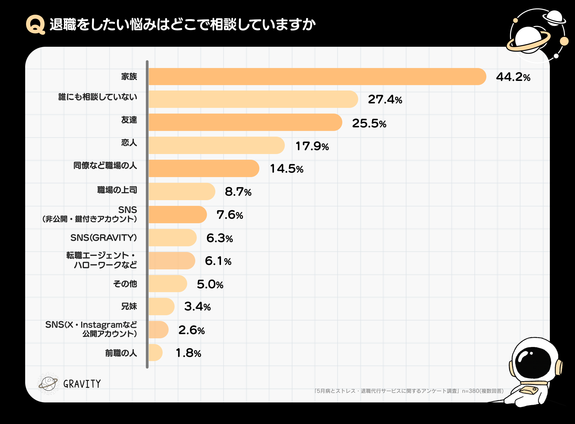 退職の悩みは「誰にも相談していない」が27.4%、SNSでは鍵付き・非公開アカウント・匿名性が高いアプリの使用も。