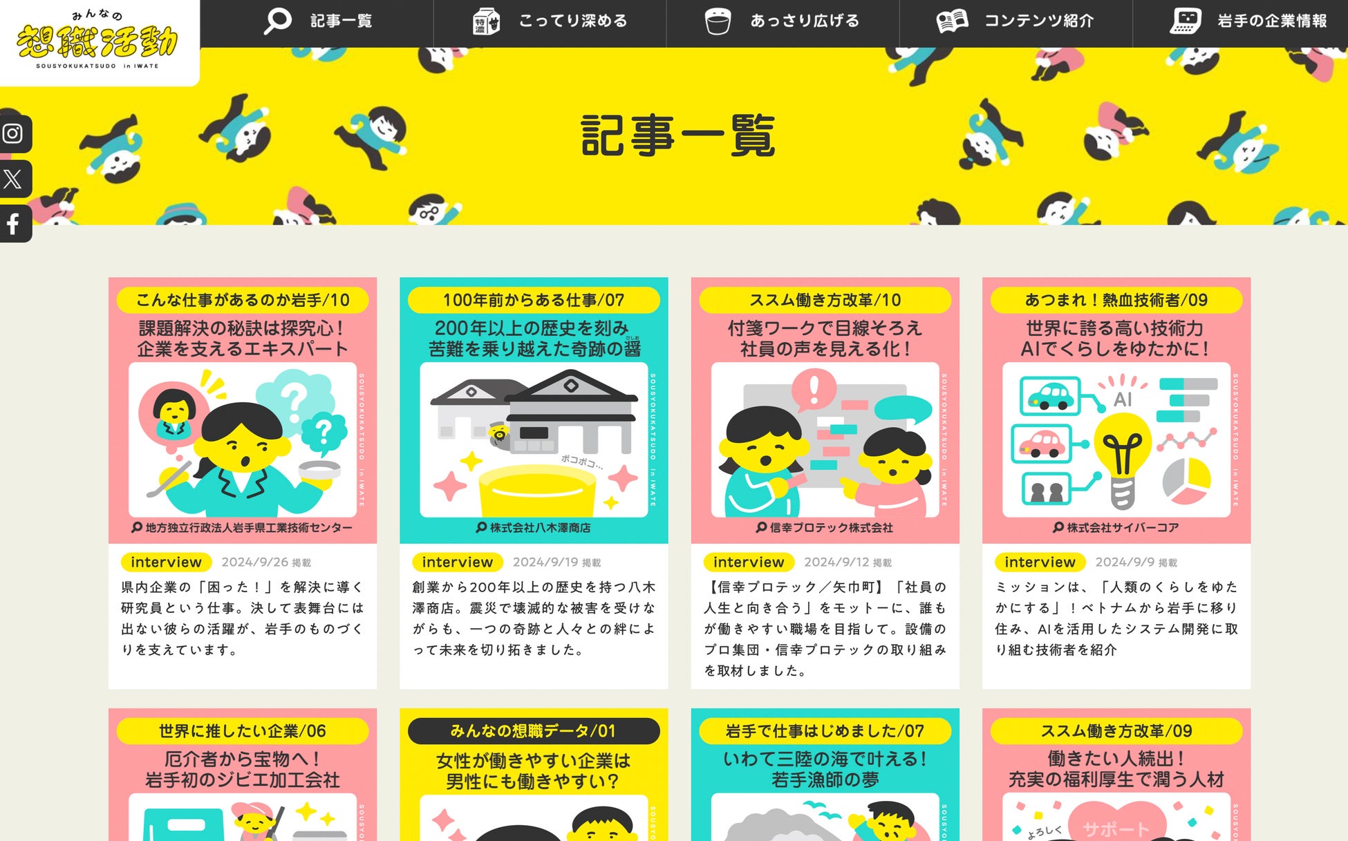 このサイトは、岩手県への移住定住やU・Iターンの促進、若年者等の就職支援、そして雇用の確保を目指す施策の一環として実施しており、地元での就職や県内定住を希望する方々を幅広く支援しています。学生を中心とした若者が手軽に仕事に関する情報を得られるよう、カジュアルな切り口でまとめた文章とポップで親しみやすいイラストを採用し、企業の社風や働き方に焦点を当てたインタビュー記事や、働く環境を知ることができるコラムなどを毎月掲載中です。地元でのキャリア形成の促進や、岩手県の仕事や暮らしの魅力を県外在住者に対して伝えることで、地域経済の活性化と持続可能な社会の構築を目指しています。