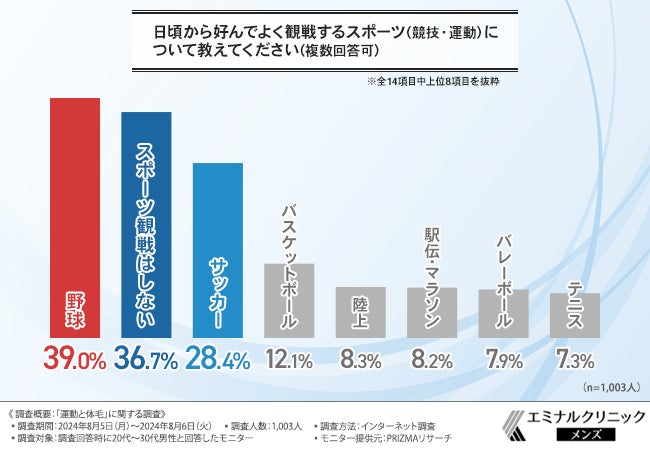はじめに、「日頃から好んでよく観戦するスポーツ(競技・運動)について教えてください(複数回答可)」と質問したところ、『野球(39.0%)』と回答した方が最も多く、次いで『スポーツ観戦はしない(36.7%)』『サッカー(28.4%)』となりました。