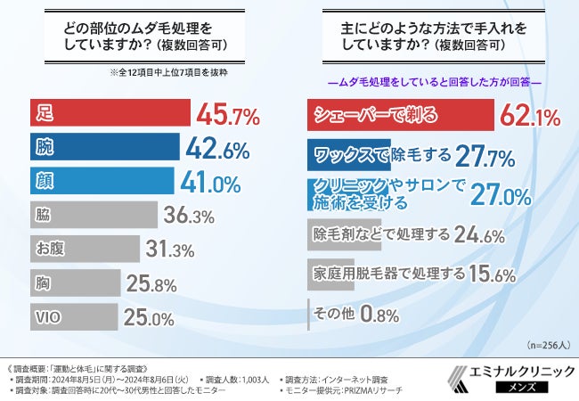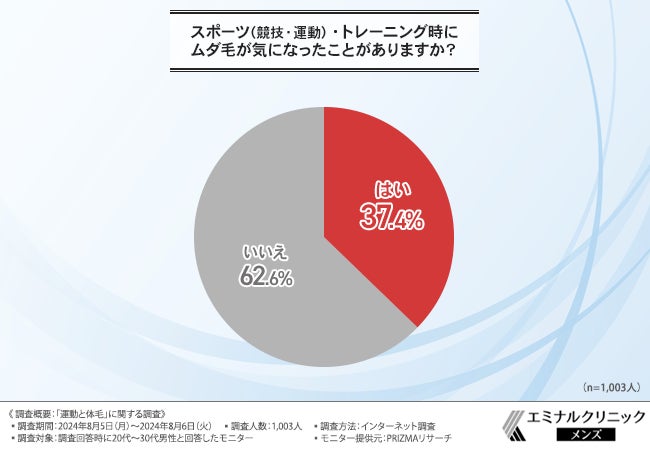 そこで今回、スポーツ(競技・運動)・トレーニングを行っている方の体毛事情に焦点をあてるべく、メンズ専用脱毛クリニック・エミナルクリニックメンズは、20代~30代男性を対象に、「運動と体毛」に関する調査を実施しました。