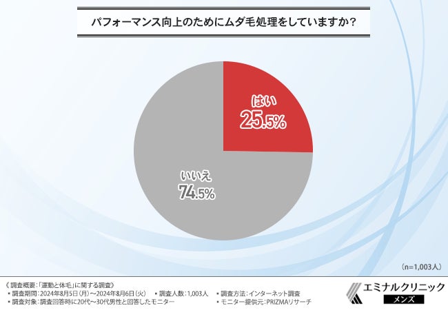 「パフォーマンス向上のためにムダ毛処理をしていますか?」と質問したところ、『はい(25.5%)』『いいえ(74.5%)』という回答結果になりました。