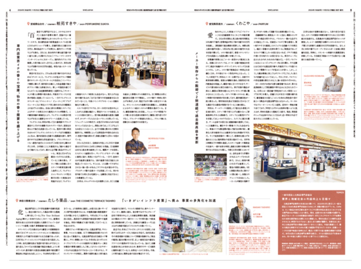 本特集では、全国の有力化粧品専門店6社の最前線を徹底解剖。北海道・旭川のくどう(コスメ910)、宮城・仙台の粧苑すきや(パフューマリースキヤ)、神奈川・横浜のたしろ薬品(ザ・コスメティックテラス タシロ)、長野・松本の田立屋、東海エリアのくわこや(パルファン)、全国に店舗を広げるアイスタイルリテール(アットコスメストア)の、独自の成長戦略や課題へのアプローチを紐解きながら、変革する業界の未来図を描きます。
