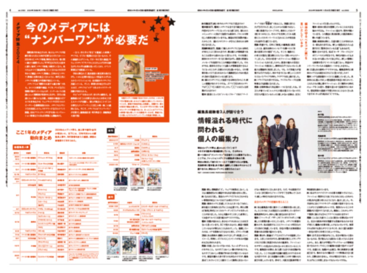 今回の特集は、"ナンバーワン"を軸にした3本立です。まずは、メディアを取り巻く環境が劇的に変わった状況で、唯一無二な媒体を作るにはどうするべきかを編集長経験者に聞きます。「ハーパーズ バザー(Harper's BAZAAR)」日本版、「装苑」「WWDジャパン」元編集長であり、現在は独立して各々の活動に励む、塚本香、児島幹規、向千鶴がこのテーマについて鼎談します。"ナンバーワン"を磨いてきたベテランたちによる金言が満載です。