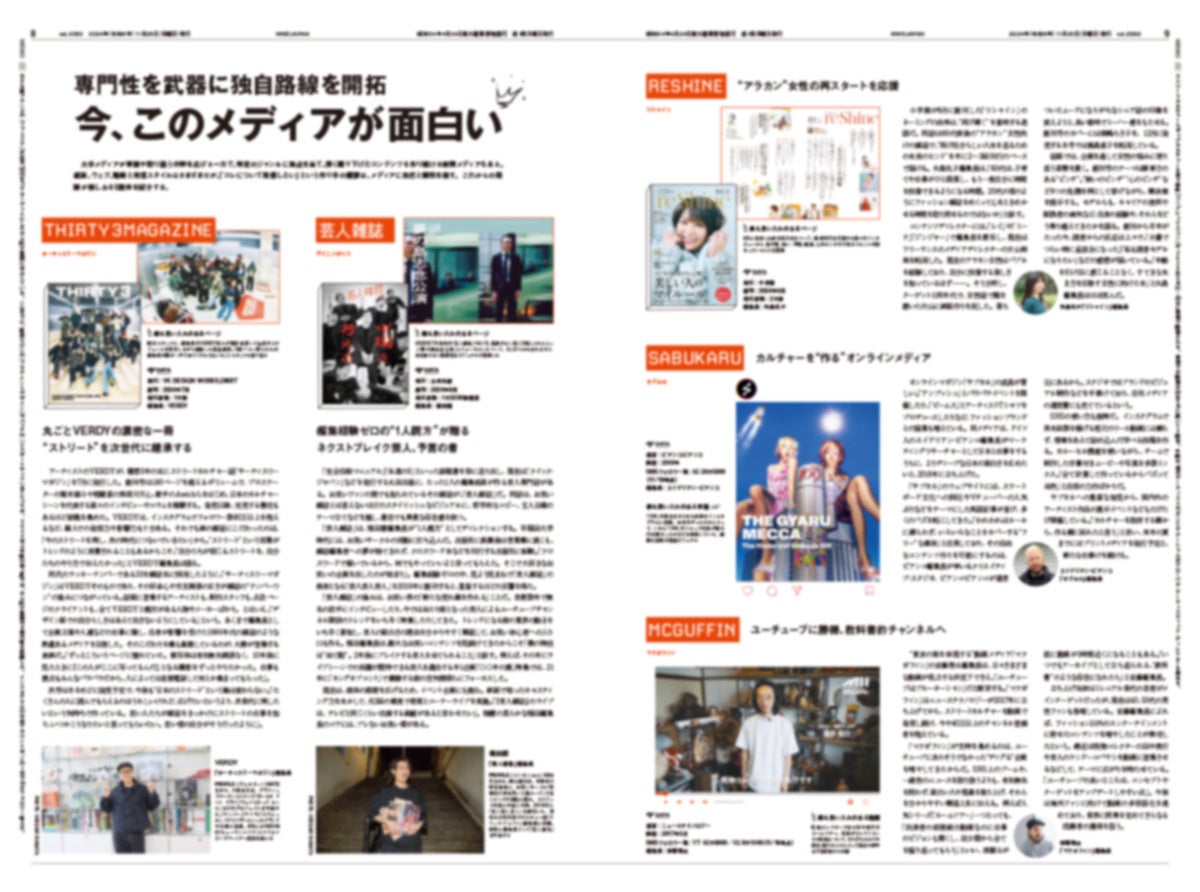 個性あふれる編集部員たちにもスポットを当てました。ユニークな媒体には、そのキャラクターを支えてくれる面々が存在します。各媒体が誇る自慢のスタッフ21人を“〇〇なエース”とし、その仕事ぶりを掲載します。さらに、専門性を武器に独自路線を貫く新興5メディアも紹介。グラフィックアーティストのVERDYが率いるストリートカルチャー誌「サーティースリーマガジン(THIRTY3MAGAZINE)」、お笑いマニア編集長の「芸人雑誌」、小学館がシニア女性に贈る「リシャイン(RESHINE)」、日本のサブカルチャーに迫るオンラインマガジン「サブカル(SABUKARU)」、東京のカルチャーを深掘る動画メディア「マクガフィン(MCGAFFIN)」にフォーカスします。