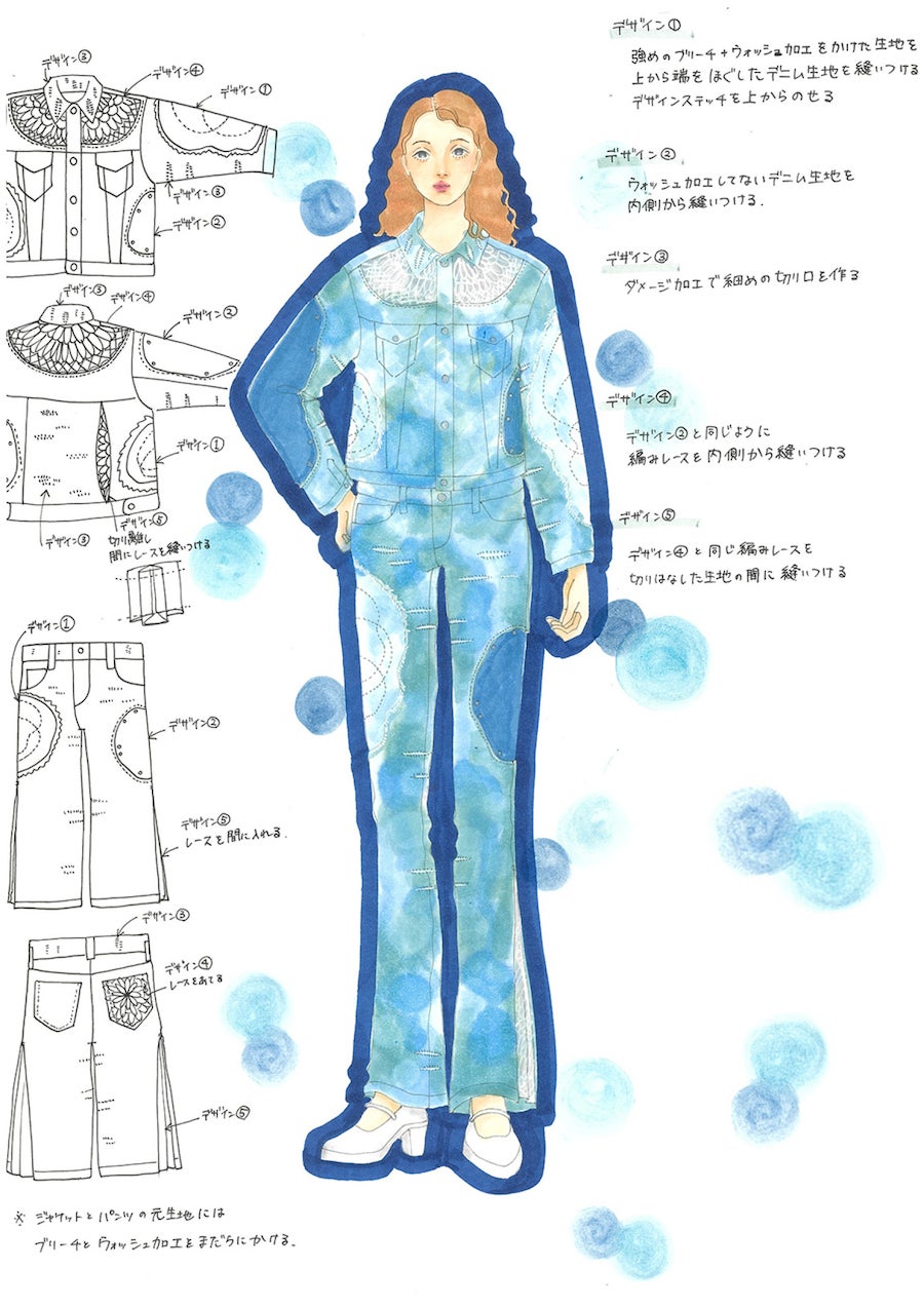 スーパーデザイナー学科およびファッション・クリエイター学科の有志学生を募り、学内コンペ「Re:デニム:再発見と再創造」を実施しました。選出された5名の学生は、岡山・児島の産地企業 ㈱WHOVALのクラフトマンのサポートを受けて、「世界にたった1つ」の一点ものの作品を制作しました。