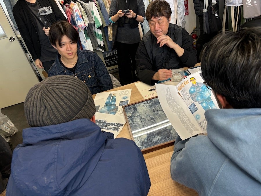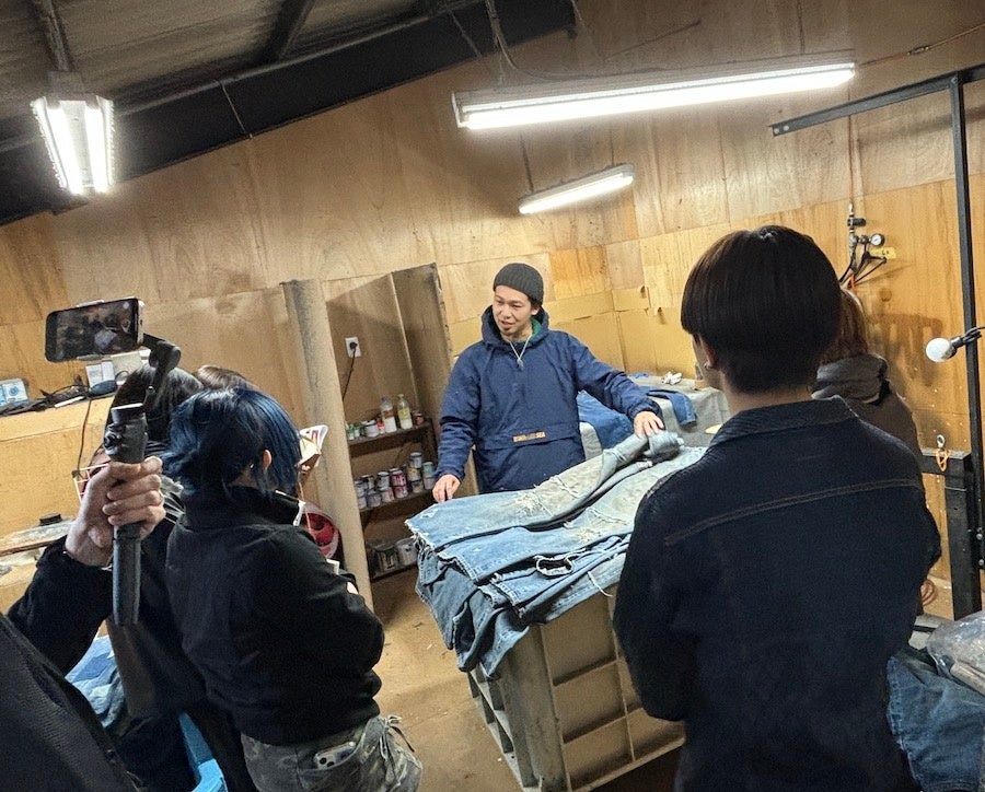 2025年1月に国内有数のデニム産地である岡山県倉敷市児島へ産地研修ツアーを実施。倉敷市のコーディネートのもと児島地区のデニム加工現場を見学したほか、今回2次加工を担当した㈱WHOVALと作品制作の打ち合わせを実施。