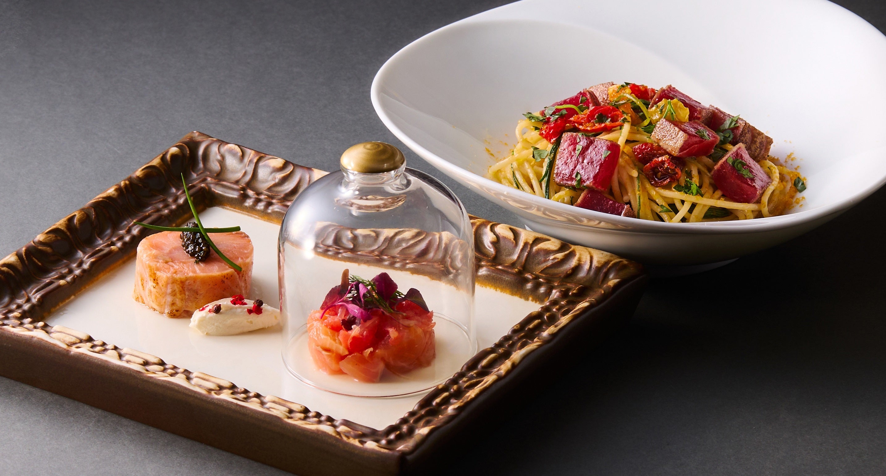 クロマグロの表面を炙り、香ばしく仕上げました。マグロのカラスミをトッピングし、相性の良いニンニクとトマトのソースに絡めています。ドライトマトの甘味と、おかひじきの食感と合わせてお楽しみください。マグロと、カラスミが彩り豊かに、目でもお楽しみいただけるメニューです。