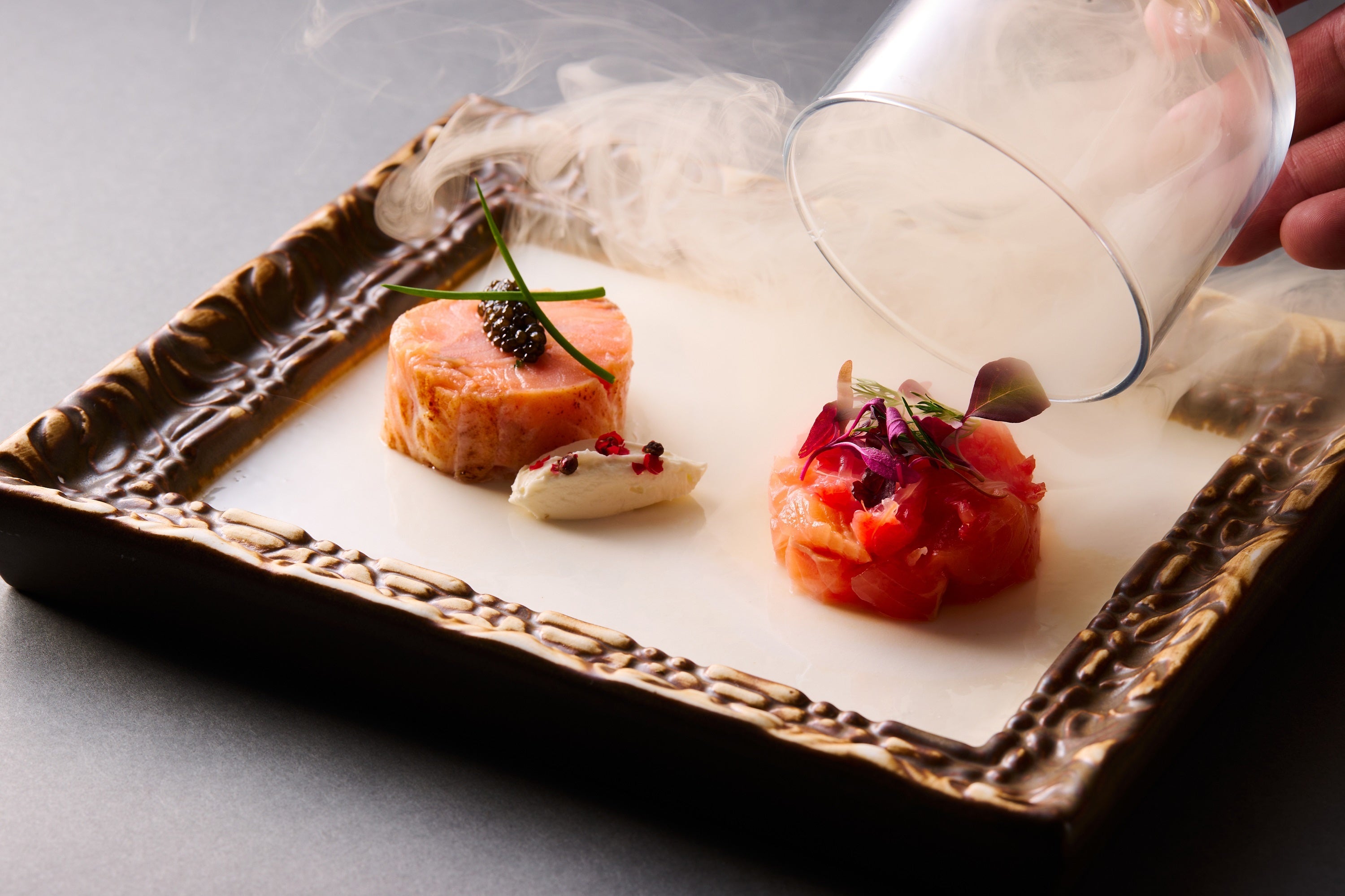 ソミュールでマリネしたサーモンに、サワークリームとキャビアを添えた一品と、タルタルにしたサーモンをビネガーでマリネしたグレープフルーツと共に、瞬間燻製をした一品を合わせてご提供いたします。おかそだちサーモンは、人工海水を循環・浄化しながら育てられたサーモンです。独自のろ過システムで人工海水を100%循環させて養殖されており、海を汚さない、地球に優しいサステナブルな食材として注目を集めています。