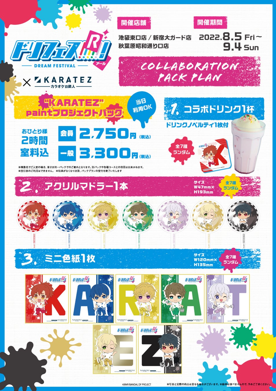 コラボ実施全店で、『ドリフェス!R』の2つのユニット「DearDream」と「KUROFUNE」をイメージしたコラボドリンクを販売するほか、池袋東口店、新宿大ガード店、秋葉原昭和通り口店では、カラオケをより楽しんでいただくためのパックプランの販売、さらにコラボグッズを販売します。