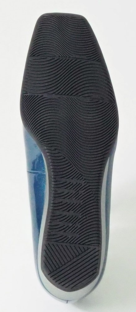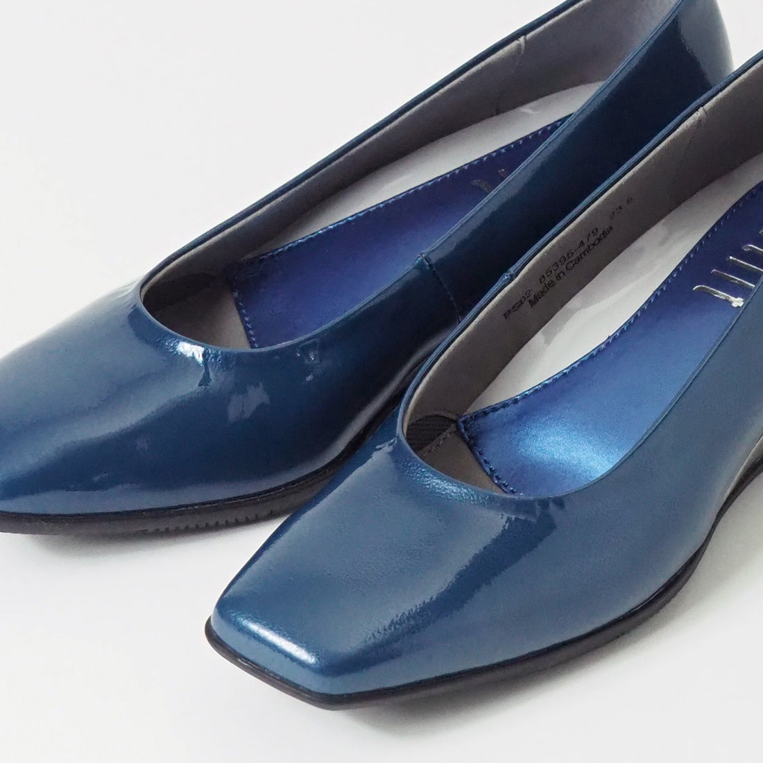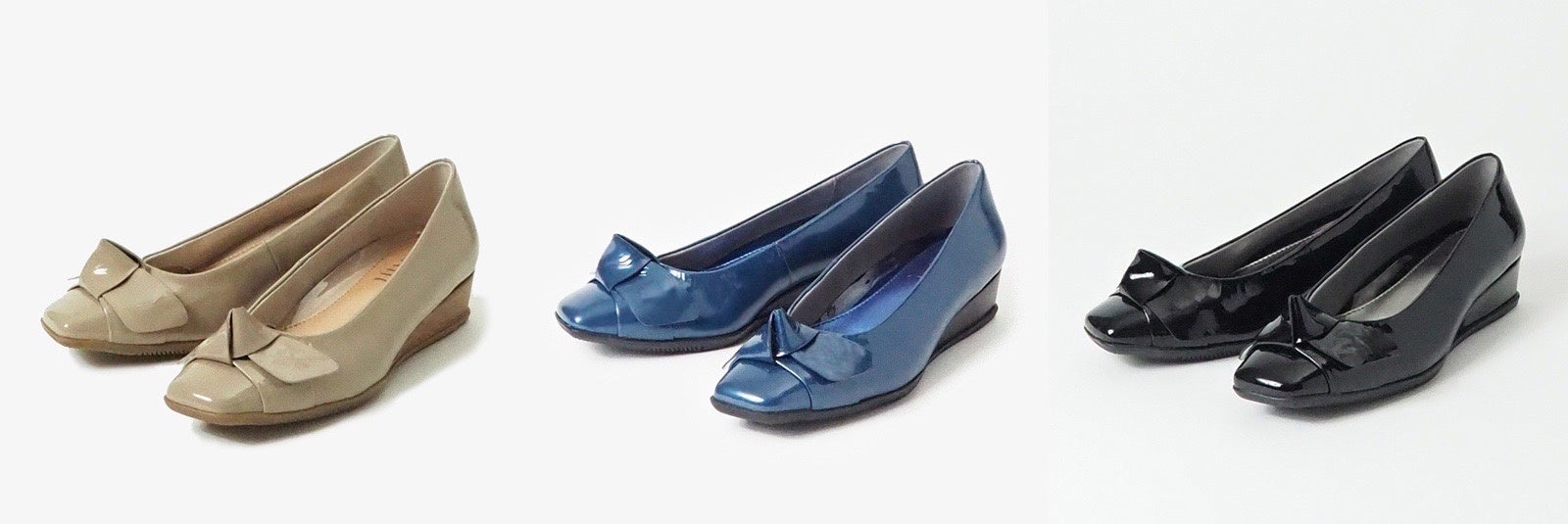 1. 足本来の形に合わせやや斜めにデザインしたスクエアトウがスタイリッシュな、ウェッジソールのパンプスです。足そのものの形と同様に高低差を付けたつま先の形状と、靴先から甲までを長めに設計する工夫により、パンプスにありがちな足指の窮屈感を解消しています。また、履き口にゴムを入れているので、足にピッタリとフィットし踵抜けを予防。それぞれの足に合わせた適度なホールド感により、快適な歩行を叶えます。