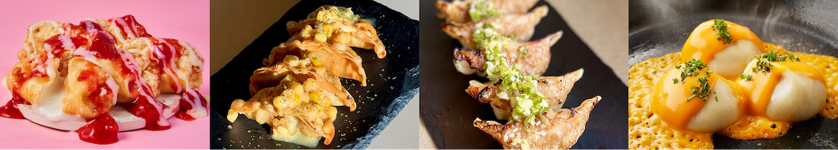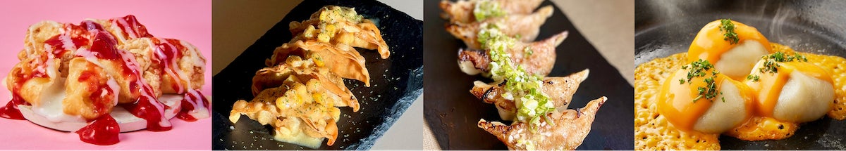 ソースや皮で彩りを加えた華やかな“メイクアップ餃子”は、思わず写真に収めたくなる存在。【玉川精肉店】の「いちごみるくチーズ餃子」は、とろけるチーズを包み込み、ゴロッとしたいちご入りのミルクソースをかけて味わうスイーツ系餃子。見た目も味わいもラブリーで、インパクト抜群の一皿。 北海道十勝産のとうもろこしを使った【餃子とワイン 果皮と餡】の「バター醤油の揚げトウモロコシ餃子」は、香ばしいバター醤油に甘みあるトウモロコシの粒を加えたポップな揚げ餃子。同店からは北海道産昆布と塩麹でじっくりマリネした牛タンを使った「旨味溢れるコリコリ牛タン餃子」も登場。埼玉の餃子専門店【餃子の宮でんでん】の「チーズのせ爆汁丸餃子」は、ぷるんとした皮が特徴の丸餃子にチーズソースを絡めた一品。噛んだ瞬間にアツアツの肉汁が口いっぱいに溢れ出す。