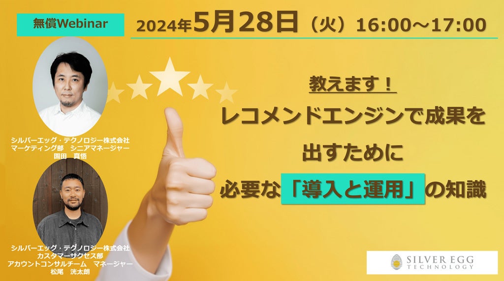 AI技術をベースとしたデジタルマーケティングサービスを提供するシルバーエッグ・テクノロジー株式会社(本社:大阪府吹田市、代表取締役社長&CEO:トーマス・フォーリー、証券コード 3961、以下 シルバーエッグ)は、2024年5月28日(火)にウェビナー「教えます! レコメンドエンジンで成果を出すために必要な『導入と運用』の知識」を開催します。
