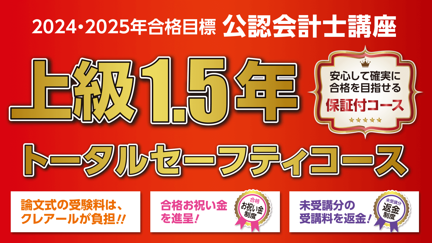 2024年・25年8月の公認会計士論文式試験の合格を目指す「上級1.5年トータルセーフティコース」を11月末まで期間限定割引価格にて販売しております。日商簿記1級受験後、公認会計士資格を目指す方は是非検討ください。